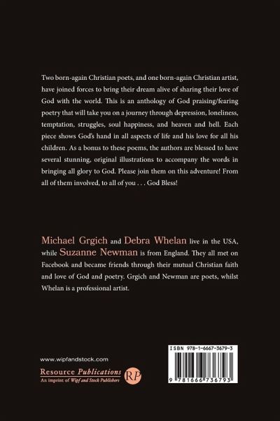 Two born-again Christian poets, and one born-again Christian artist, have joined forces to bring their dream alive of sharing their love of God with the world. This is an anthology of God praising/fearing poetry that will take you on a journey through depression, loneliness, temptation, struggles, soul happiness, and heaven and hell. Each piece shows God's hand in all aspects of life and his love for all his children. As a bonus to these poems, the authors are blessed to have several stunning, original illustrations to accompany the words in bringing all glory to God. Please join them on this adventure! From all of them involved, to all of you . . . God Bless!