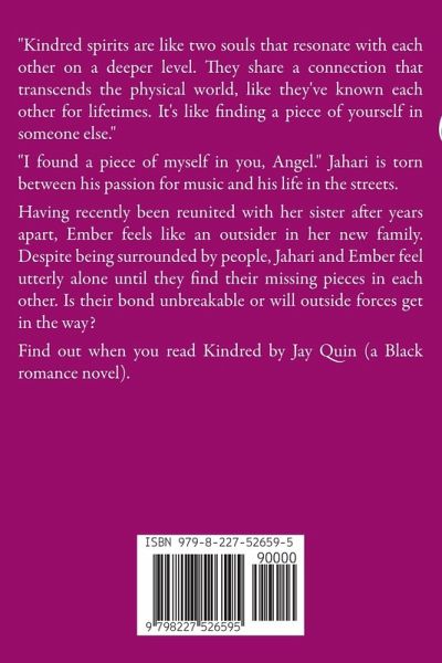 "Kindred spirits are like two souls that resonate with each other on a deeper level. They share a connection that transcends the physical world, like they've known each other for lifetimes. It's like finding a piece of yourself in someone else." "I found a piece of myself in you, Angel." Jahari is torn between his passion for music and his life in the streets. Having recently been reunited with her sister after years apart, Ember feels like an outsider in her new family. Despite being surrounded by people, Jahari and Ember feel utterly alone until they find their missing pieces in each other. Is their bond unbreakable or will outside forces get in the way? Find out when you read Kindred by Jay Quin (a Black romance novel).
