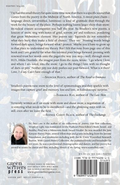Nature provides the lexicon of de Kooning Snow. The poems in de Kooning Snow negotiate many kinds of loss, metaphorically represented as kinds of snow. Classifications of snow, such as prisms, cups, columns, dendrites, and scrolls, mark places among the poems as when, in a weaving, the warp becomes visible. The title poem frames presence, meaning, memory, and erasure. Several of the poems are contained in panels like Rauschenberg’s White Paintings. As the poem "Glacier" reflects, the arc of the book is lyrical rather than narrative, "from point A to point A, no point at all." The poem "The Last of" placed second for the Joy Harjo Poetry Award judged by Dorianne Laux. Three of the poems have been nominated for a Pushcart Prize; ten have been anthologized.