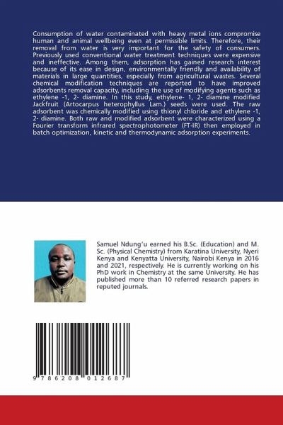 Consumption of water contaminated with heavy metal ions compromise human and animal wellbeing even at permissible limits. Therefore, their removal from water is very important for the safety of consumers. Previously used conventional water treatment techniques were expensive and ineffective. Among them, adsorption has gained research interest because of its ease in design, environmentally friendly and availability of materials in large quantities, especially from agricultural wastes. Several chemical modification techniques are reported to have improved adsorbents removal capacity, including the use of modifying agents such as ethylene -1, 2- diamine. In this study, ethylene- 1, 2- diamine modified Jackfruit (Artocarpus heterophyllus Lam.) seeds were used. The raw adsorbent was chemically modified using thionyl chloride and ethylene -1, 2- diamine. Both raw and modified adsorbent were characterized using a Fourier transform infrared spectrophotometer (FT-IR) then employed in batch optimization, kinetic and thermodynamic adsorption experiments.