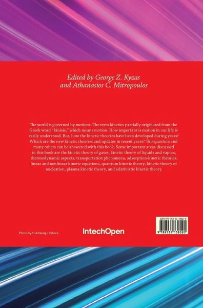 The world is governed by motions. The term kinetics partially originated from the Greek word "kinisis," which means motion. How important is motion in our life is easily understood. But, how the kinetic theories have been developed during years? Which are the new kinetic theories and updates in recent years? This question and many others can be answered with this book. Some important areas discussed in this book are the kinetic theory of gases, kinetic theory of liquids and vapors, thermodynamic aspects, transportation phenomena, adsorption-kinetic theories, linear and nonlinear kinetic equations, quantum kinetic theory, kinetic theory of nucleation, plasma kinetic theory, and relativistic kinetic theory.