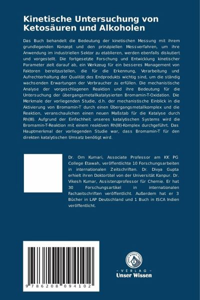 Das Buch behandelt die Bedeutung der kinetischen Messung mit ihrem grundlegenden Konzept und den prinzipiellen Messverfahren, um ihre Anwendung im industriellen Sektor zu etablieren, werden ebenfalls diskutiert und vorgestellt. Die fortgesetzte Forschung und Entwicklung kinetischer Parameter zielt darauf ab, ein Werkzeug für ein besseres Management von Faktoren bereitzustellen, die für die Erkennung, Verarbeitung und Aufrechterhaltung der Qualität des Endprodukts wichtig sind, um die ständig wachsenden Erwartungen der Verbraucher zu erfüllen. Die mechanistische Analyse der vorgeschlagenen Reaktion und ihre Bedeutung für die Untersuchung der übergangsmetallkatalysierten Bromamin-T-Oxidation. Die Merkmale der vorliegenden Studie, d.h. der mechanistische Einblick in die Aktivierung von Bromamin-T durch einen Übergangsmetallkomplex und die Reaktion, veranschaulichen einen neuen Maßstab für die Katalyse durch Rh(III). Aufgrund der Einfachheit unseres katalytischen Systems wird die Bromamin-T-Reaktion mit einem reaktiven Rh(III)-Komplex durchgeführt. Das Hauptmerkmal der vorliegenden Studie war, dass Bromamin-T für den direkten katalytischen Umsatz benötigt wird.
