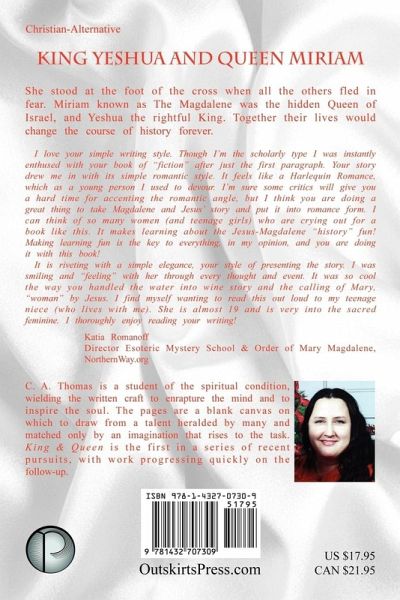 King Yeshua and Queen Mariam She stood at the foot of the cross when all the others fled in fear. Mariam known as The Magdalene was the hidden Queen of Israel, and Yeshua the rightful King. Together their lives would change the course of history forever. I love your simple writing style. Though I'm the scholarly type I was instantly enthused with your book of "fiction" after just the first paragraph. Your story drew me in with its simple romantic style. It feels like a Harlequin Romance, which as a young person I used to devour. I'm sure some critics will give you a hard time for accenting the romantic angle, but I think you are doing a great thing to take Magdalene and Jesus' story and put it into romance form. I can think of so many women (and teenage girls) who are crying out for a book like this. It makes learning about the Jesus-Magdalene "history" fun! Making learning fun is the key to everything, in my opinion, and you are doing it with this book! It is riveting with a simple elegance, your style of presenting the story. I was smiling and "feeling" with her through every thought and event. It was so cool the way you handled the water into wine story and the calling of Mary, "woman" by Jesus. I find myself wanting to read this out loud to my teenage niece (who lives with me). She is almost 19 and is very into the sacred feminine. I thoroughly enjoy reading your writing! Katia Romanoff Director Esoteric Mystery School & Order of Mary Magdalene NorthernWay.org