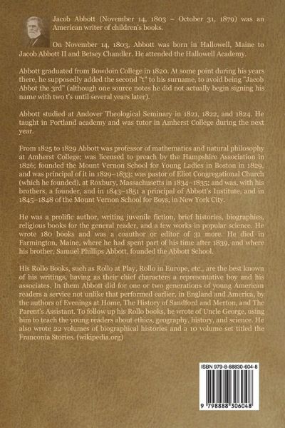 Abbott is an excellent story teller and historian. Though short, his series on history serves as an excellent primer. (Patrick Trester) About the author: Jacob Abbott (November 14, 1803 - October 31, 1879) was an American writer of children's books. On November 14, 1803, Abbott was born in Hallowell, Maine to Jacob Abbott II and Betsey Chandler. He attended the Hallowell Academy. Abbott graduated from Bowdoin College in 1820. At some point during his years there, he supposedly added the second "t" to his surname, to avoid being "Jacob Abbot the 3rd" (although one source notes he did not actually begin signing his name with two t's until several years later). Abbott studied at Andover Theological Seminary in 1821, 1822, and 1824. He taught in Portland academy and was tutor in Amherst College during the next year. From 1825 to 1829 Abbott was professor of mathematics and natural philosophy at Amherst College; was licensed to preach by the Hampshire Association in 1826; founded the Mount Vernon School for Young Ladies in Boston in 1829, and was principal of it in 1829-1833; was pastor of Eliot Congregational Church (which he founded), at Roxbury, Massachusetts in 1834-1835; and was, with his brothers, a founder, and in 1843-1851 a principal of Abbott's Institute, and in 1845-1848 of the Mount Vernon School for Boys, in New York City. He was a prolific author, writing juvenile fiction, brief histories, biographies, religious books for the general reader, and a few works in popular science. He wrote 180 books and was a coauthor or editor of 31 more. He died in Farmington, Maine, where he had spent part of his time after 1839, and where his brother, Samuel Phillips Abbott, founded the Abbott School. His Rollo Books, such as Rollo at Play, Rollo in Europe, etc., are the best known of his writings, having as their chief characters a representative boy and his associates. In them Abbott did for one or two generations of young American readers a service not unlike that performed earlier, in England and America, by the authors of Evenings at Home, The History of Sandford and Merton, and The Parent's Assistant. To follow up his Rollo books, he wrote of Uncle George, using him to teach the young readers about ethics, geography, history, and science. He also wrote 22 volumes of biographical histories and a 10 volume set titled the Franconia Stories. (wikipedia.org)