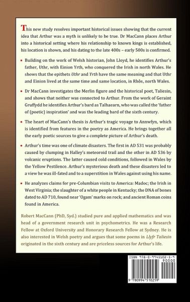 Hardcover: Case Laminate PPCThis new study resolves important historical issues and shows that the current idea that Arthur was a myth is unlikely to be true. Robert MacCann places Arthur into a historical setting where his relationship to known kings is established, his location is shown, and his dating to the late 400s - early 500s is confirmed.Building on the work of Welsh historian, John Lloyd, he identifies Arthur's father, Uthr, with Einion Yrth, who conquered the Irish in north Wales. He shows that the epithets Uthr and Yrth have the same meaning and that Uthr and Einion lived at the same time and same location, in Rhôs, north Wales. Dr MacCann investigates the Merlin figure and the historical poet, Taliesin and shows that neither was connected to the historical Arthur. From the work of Geraint Gruffydd he identifies Arthur's bard as Talhaearn, who was called the 'father of (poetic) inspiration' and was the leading bard of the sixth century. The heart of MacCann's thesis is Arthur's tragic voyage to Annwfyn, identified from features in the poetry as America. He brings together all the early poetic sources to give a complete picture of Arthur's death. Arthur's time was one of climate disasters. The first in AD 531 was probably caused by clumping in Halley's meteoroid trail and the other in 536 by volcanic eruptions. The latter caused cold conditions, followed in Wales by the Yellow Pestilence. Arthur's mysterious death and these disasters led to the view that he was ill-fated and to a superstition in Wales against using his name. He analyzes claims for pre-Columbian visits to America: Madoc; the Irish in West Virginia; the slaughter of a white people in Kentucky; the DNA of bones dated to 710, found near 'Ogam' marks; and ancient Roman coins in America.