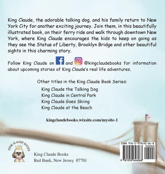 King Claude, the adorable talking dog, and his family return to New York City for another exciting journey. Join them in this beautifully illustrated book on their ferry ride and walk through downtown New York, where King Claude encourages the kids to keep on going as they see the Statue of Liberty, Brooklyn Bridge and other beautiful sights.