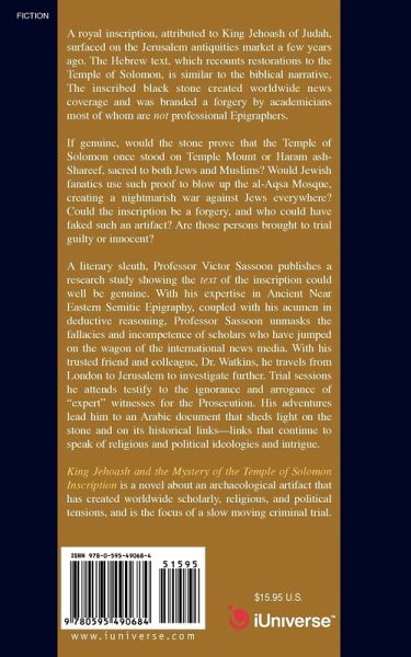 A royal inscription, attributed to King Jehoash of Judah, surfaced on the Jerusalem antiquities market a few years ago. The Hebrew text, which recounts restorations to the Temple of Solomon, is similar to the biblical narrative. The inscribed black stone created worldwide news coverage and was branded a forgery by academicians most of whom are not professional Epigraphers. If genuine, would the stone prove that the Temple of Solomon once stood on Temple Mount or Haram ash-Shareef, sacred to both Jews and Muslims? Would Jewish fanatics use such proof to blow up the al-Aqsa Mosque, creating a nightmarish war against Jews everywhere? Could the inscription be a forgery, and who could have faked such an artifact? Are those persons brought to trial guilty or innocent? A literary sleuth, Professor Victor Sassoon publishes a research study showing the text of the inscription could well be genuine. With his expertise in Ancient Near Eastern Semitic Epigraphy, coupled with his acumen in deductive reasoning, Professor Sassoon unmasks the fallacies and incompetence of scholars who have jumped on the wagon of the international news media. With his trusted friend and colleague, Dr. Watkins, he travels from London to Jerusalem to investigate further. Trial sessions he attends testify to the ignorance and arrogance of "expert" witnesses for the Prosecution. His adventures lead him to an Arabic document that sheds light on the stone and on its historical links-links that continue to speak of religious and political ideologies and intrigue. King Jehoash and the Mystery of the Temple of Solomon Inscription is a novel about an archaeological artifact that has created worldwide scholarly, religious, and political tensions, and is the focus of a slow moving criminal trial.