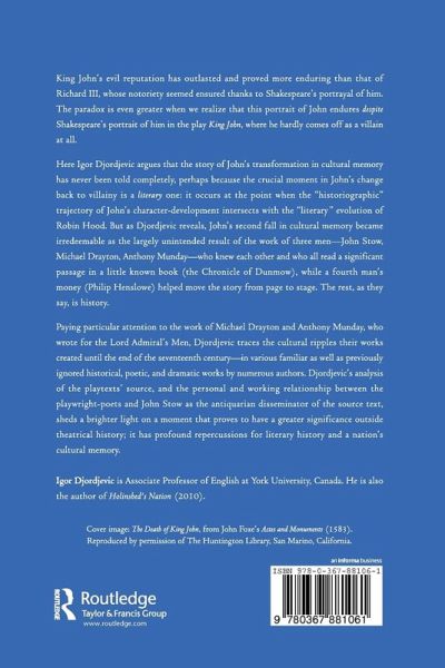 King John's evil reputation has outlasted and proved more enduring than that of Richard III, whose notoriety seemed ensured thanks to Shakespeare's portrayal of him. The paradox is even greater when we realize that this portrait of John endures despite Shakespeare's portrait of him in the play King John, where he hardly comes off as a villain at all. Here Igor Djordjevic argues that the story of John's transformation in cultural memory has never been told completely, perhaps because the crucial moment in John's change back to villainy is a literary one: it occurs at the point when the 'historiographic' trajectory of John's character-development intersects with the 'literary' evolution of Robin Hood. But as Djordjevic reveals, John's second fall in cultural memory became irredeemable as the largely unintended result of the work of three men - John Stow, Michael Drayton, Anthony Munday - who knew each other and who all read a significant passage in a little known book (the Chronicle of Dunmow), while a fourth man's money (Philip Henslowe) helped move the story from page to stage. The rest, as they say, is history. Paying particular attention to the work of Michael Drayton and Anthony Munday who wrote for the Lord Admiral's Men, Djordjevic traces the cultural ripples their works created until the end of the seventeenth century, in various familiar as well as previously ignored historical, poetic, and dramatic works by numerous authors. Djordjevic's analysis of the playtexts' source, and the personal and working relationship between the playwright-poets and John Stow as the antiquarian disseminator of the source text, sheds a brighter light on a moment that proves to have a greater significance outside theatrical history; it has profound repercussions for literary history and a nation's cultural memory.