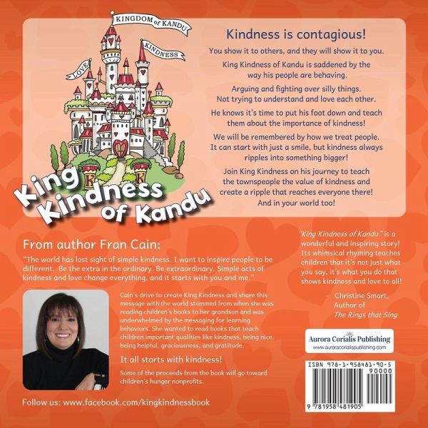 ***King Kindness of Kandu was selected as a finalist (top three) for the coveted The Author Zone Award for children's fiction excellence for 2023.*** Kindness is contagious! You show it to others, and they will show it to you. King Kindness of Kandu is saddened by the way his people are behaving. Arguing and fighting over silly things. Not stepping back to try to understand and love each other. He knows it's time to put his foot down and teach them about the importance of kindness! We will be remembered by how we treat people. It can start with just a smile, but kindness always ripples into something bigger! Join King Kindness on his journey to teach the townspeople the value of kindness and create a ripple that reaches everyone there! And in your world too! ------------------------------------------------------------------------------------- From author Fran Cain: "The world has lost sight of simple kindness. I want to inspire people to be different. Be the extra in the ordinary. Be extraordinary. Simple acts of kindness and love change everything, and it starts with you and me." Cain's drive to create King Kindness and share this message with the world stemmed from when she was reading children's books to her grandson and was underwhelmed by the messaging for learning behaviors. She wanted to read books that teach children important qualities like kindness, being nice, being helpful, graciousness, and gratitude. It all starts with kindness! Some of the proceeds from the book will go toward children's hunger nonprofits. Watch for future inspiring books from Fran Cain!