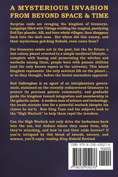 A MYSTERIOUS INVASION FROM BEYOND SPACE AND TIME Surprise raids are ravaging the kingdom of Gramarye. Longships filled with Vikings wielding the magical, paralyzing Evil Eye plunder, kill, and burn whole villages, then disappear back into the dark seas. But where did this enemy, and their mysterious god-king Kobold, even come from? For Gramarye exists not in the past, but the far future: a lost colony planet that's reverted to a simple medieval lifestyle... complete with fearing and persecuting the witches and warlocks among them, people born with natural psionic abilities (and the only known espers in the universe). This island kingdom represents the only sentient life on the planet... or so they thought, before the brutal marauders appeared. Rod Gallowglass is an agent of an interplanetary government, stationed on the recently rediscovered Gramarye to protect its precious psionic community, and gradually guide the kingdom toward integration and membership in the galactic union. A modern man of science and technology, the locals mistake him for a powerful warlock (despite his claims he isn't). Now King Tuan and his subjects look to the "High Warlock" to help them repel the invaders. Can the High Warlock not only drive the barbarians back into the sea, but deduce where they came from, why they're attacking, and how to end their raids forever? If you're intrigued by this blend of swords, sorcery, and science, you'll enjoy reading King Kobold Revived.