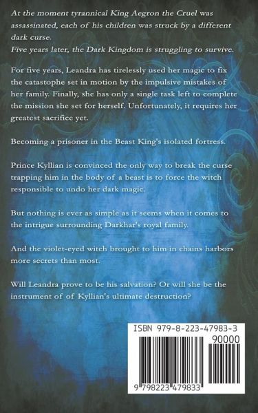 At the moment tyrannical King Aegron the Cruel was assassinated, each of his children was struck by a different dark curse. Five years later, the Dark Kingdom is struggling to survive. For five years, Leandra has tirelessly used her magic to fix the catastrophe put in motion by the impulsive mistakes of her family. Finally, she has only a single task left to complete the mission she set for herself. Unfortunately, it requires her greatest sacrifice yet. Becoming a prisoner in the Beast King's isolated fortress. Prince Kyllean is convinced the only way to break the curse trapping him in the body of a beast is to force the witch responsible to undo her dark magic. But nothing is ever as simple as it seems when it comes to the intrigue surrounding Darkhar's royal family. And the violet-eyed witch brought to him in chains harbors more secrets than most. Will Leandra prove to be his salvation? Or will she be the instrument of Kyllean's ultimate destruction? This Beauty and the Beast inspired fantasy romance novel features a stubborn, arrogant prince cursed into beastly form, a witch trying to set things right with or without his help, enemies falling in love, and a pack of terrifyingly adorable monsters.