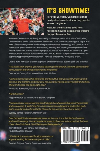 We've all seen him. The wild dancing guy throwing shirts at major sporting events from the Olympics to the NBA Finals. And we've all wondered..."Who IS that guy?" THAT guy is...Cameron Hughes. And yes...THAT is his job. For over 26 years, Cameron Hughes has ignited crowds at sporting events across the globe. The only professional sports entertainer of his kind in the world, Cameron has performed at over 1,500 events including 2 Olympic Games, 5 NBA Finals, 2 Stanley Cup Finals, and the US Open tennis tournament. His relentless optimism, infectious cheering, and unbridled dancing have delighted and energized unsuspecting crowds, infusing Cameron's indelible spirit in over 30 million people's memory banks - often without anyone even knowing who the man with the famous dance moves really is. So now, for the first time ever, Cameron is letting everyone in on his big secret - how he became the world's first professional fan. His new memoir KING OF CHEER is an inspiring story of perseverance and self-belief that recounts how he took his genuine love for people and turned it into the most unlikely of careers. Starting from humble roots in Ottawa, Canada, this is the once-in-a-lifetime collection of his best stories from a love-able underdog who couldn't make his high school basketball team but would eventually rub shoulders with the titans of sport on the world's biggest stages. Cameron has showcased his engaging style of bringing people together during memorable interactions with the likes of Steve Nash, Roger Federer, Novak Djokovic, Connor McDavid, Wayne, and Janet Gretzky, Michael Andretti, Katie Couric, Alanis Morissette, Trevor Noah, Russell Peters, Prince, a Supertrooper, and even a few Prime Ministers. He ignites a spark in everyone he meets, creating great stories that are ready to share. Although Cameron specializes in helping people laugh and let go, the heart of his story is equally about taking risks, challenging social conventions, seeking peak performance, and contributing to a greater purpose. His unorthodox method of connecting and inspiring crowds have been put into action not only at the world's highest-profile sporting events but also at corporate events for some of the world's most renowned companies, and in philanthropic service to those in need. Behind the KING OF CHEER is also a uniquely human story, as Cameron recounts the highs and lows of his improbable journey. From his lifelong struggles with ADHD to difficult family challenges in high school - a moment that would shape the rest of his life - KING OF CHEER is a transcendent celebration of the human spirit. In Cameron's own words, "I hope my story will inspire you to cheer a little louder, smile a little wider, dance a little crazier, contribute to your team, be fearless, and most importantly, to GET UP and become your own biggest fan. I'm thrilled to take you on my journey and show you the true power of cheer."