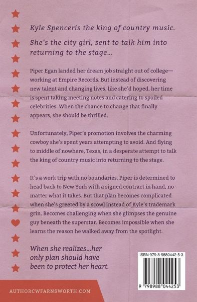 Kyle Spencer is the king of country music. She's the city girl, sent to talk him into returning to the stage... ¿ Piper Egan landed her dream job straight out of college-working at Empire Records. But instead of discovering new talent and changing lives, like she'd hoped, her time is spent taking meeting notes and catering to spoiled celebrities. When the chance to change that finally appears, she should be thrilled. Unfortunately, Piper's promotion involves the charming cowboy she's spent years attempting to avoid. And flying to middle of nowhere, Texas, in a desperate attempt to talk the king of country music into returning to the stage. It's a work trip with no boundaries. Piper is determined to head back to New York with a signed contract in hand, no matter what it takes. But that plan becomes complicated when she's greeted by a scowl instead of Kyle's trademark grin. Becomes challenging when she glimpses the genuine guy beneath the superstar. Becomes impossible when she learns the reason he walked away from the spotlight. When she realizes...her only plan should have been to protect her heart.