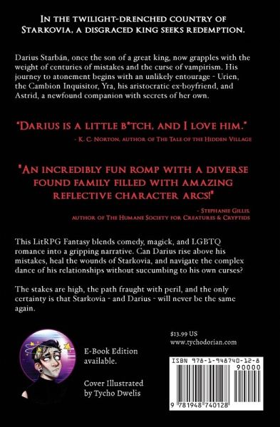 In the twilight-drenched country of Starkovia, a disgraced king seeks redemption. Inspired by the classic and brilliant campaign Curse of Strahd. Darius Starbán, once the son of a great king, now grapples with the weight of centuries of mistakes and the curse of vampirism. Struggling under the weight of his past, Darius embarks on a journey of atonement, seeking redemption for both himself and the cursed lands of Starkovia. Darius is joined by an unlikely group of allies: Urien, a Cambion Inquisitor with a fierce sense of justice, Yra, his aristocratic ex-boyfriend whose relationship with Darius is as complex as it is strained, and Astrid, a mysterious new companion who carries her own secrets. Together, they face daunting trials, otherworldly threats, and powerful foes as they navigate their world while trying to make light of the horrors around them. A Wattys 2022 Finalist This LitRPG Fantasy blends comedy, magick, and light LGBTQ romance into a gripping narrative. Can Darius rise above his mistakes, heal the wounds of Starkovia, and navigate the complex dance of his relationships without succumbing to his own curses? The stakes are high, the path fraught with peril, and the only certainty is that Starkovia - and Darius - will never be the same again. King of Dust is a low-spice content book with fade-to-black scenes.