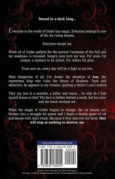 Bound to a dark king... Everyone in the world of Under has magic. Everyone belongs to one of the six ruling houses. Everyone except me. When all of Under gathers for the ancient Ceremony of the Fall and my weakness is revealed, hungry eyes turn my way. For some I'm unique, a mystery to be solved. For others I'm prey. From now on, every day will be a fight to survive. Most dangerous of all, I've drawn the attention of Aon, the mysterious king who rules the House of Shadows. Dark and seductive, he appears in my dreams, igniting a desire I can't control. They say Aon is a monster, a killer, and worse... So why do I find myself drawn to him? His face is hidden behind a mask, but his voice and his touch enchant me. When the magic of Under begins to change, the six houses are thrown into a struggle for power and I begin a deadly game of cat and mouse with Aon's rivals. Because if they discover our bond, they will stop at nothing to destroy me. King of Flames begins a steamy and addictive six-book series of villainous kings and dark romance that's perfect for fans of Raven Kennedy, Nikki St. Crowe and Penelope Barsetti. This fully revised new edition is darker and spicier than ever. See why readers love The Masks of Under series: "Oh. My. God. That was freaking spectacular!... A riveting, unique and intense ride... Amazing." Goodreads reviewer ⭐⭐⭐⭐⭐ "Wow just wow!!... This absolutely knocked my socks off... I just couldn't put this enthralling and addictive new story down...The finale here was so good, tantalising and teasing my senses." Beckie Bookworm ⭐⭐⭐⭐⭐ "OMFG... This series is amazing... I loved it, I cried a little at the end, it's just so good... You have got to read this book. Totally amazing." Goodreads reviewer ⭐⭐⭐⭐⭐ "I love everything about this series. The writing and world keep me up late reading and wanting more. The characters are so complex and original. I'm lost in this world and loving every bit of this series." Goodreads reviewer ⭐⭐⭐⭐⭐ "CHRIST ON A CRACKER... The writing was phenomenal... The plot was SO very engaging. The world building excellent." Between the Bookends ⭐⭐⭐⭐⭐ "A roller coaster... I am addicted... It really had everything, there was humor, a badass lead, an absolutely precious 'hero', epic worldbuilding and fantastic writing, I am in LOVE!" Goodreads reviewer ⭐⭐⭐⭐⭐ "Oh my God. Fantastic characters. Beautiful story progression. I have fallen in love with this series. It paints a story in your mind and pulls you into another world." Goodreads reviewer ⭐⭐⭐⭐⭐