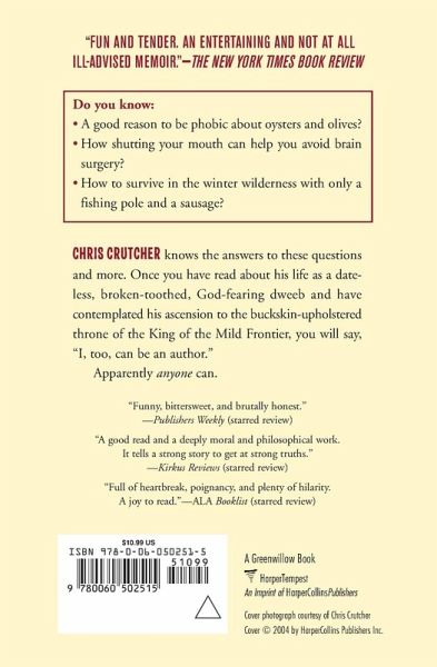 ALA Best Fiction for Young Adults * New York Public Library Books for the Teen Age A riveting, scorching—and hilarious—autobiography by the award-winning author of Staying Fat for Sarah Byrnes and Deadline. From trying to impress a member of the girls’ softball team (with disastrous dental results) to enduring the humiliation of his high school athletic club initiation (olives and oysters play unforgettable roles), Chris Crutcher’s memoir of the tricky road to adulthood is candid, disarming, laugh-out-loud funny, relevant, and never less than riveting. He vividly describes a temper that was always waiting to trip him up even as it sustained him through some of the most memorable mishaps any child has survived. And how did this guy (he lifted his brother’s homework through the entire tenth grade) ever become a writer, not to mention the author of fourteen critically acclaimed books for young people? The frontier may be mild, but the book is not. Fans of Tara Westover’s Educated, Jack Gantos’s Hole in My Life, and Walter Dean Myers’s Bad Boy will laugh, will cry, and will remember. “Funny, bittersweet and brutally honest. Readers will clasp this hard-to-put-down book to their hearts even as they laugh sympathetically.”—Publishers Weekly (starred review)