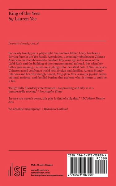 For nearly twenty years, playwright Lauren Yee's father, Larry, has been a driving force in the Yee Family Association, a seemingly obsolescent Chinese American men's club formed a hundred fifty years ago in the wake of the Gold Rush and the building of the transcontinental railroad. But when her father goes missing, Lauren must plunge into the rabbit hole of San Francisco Chinatown and confront a world both foreign and familiar. At once bitingly hilarious and heartbreakingly honest, King of the Yees is an epic joyride across cultural, national, and familial borders that explores what it means to truly be a Yee. -- Publisher website.