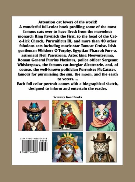 Attention cat lovers of the world! A wonderful full-color book profiling some of the most famous cats ever to have lived: from the marvelous monarch King Pawtrick the First, to the head of the Cat-o-Lick Church, Purrrnificus IX, and more than 40 other fabulous cats including movie-star Tomcat Cruise, Irish gentleman Whiskers O'Furphy, Egyptian Pharaoh Furr-o, astronaut Neil Pawstrong, Aztec king Meowntezuma, Roman General Purrius Maximus, police officer Sergeant Whiskerpaws, the famous cat-burglar Alcatrazzle, and, of course, the well-known politician Purrmises McCatster, famous for purrmissing the sun, the moon, and the earth to voters.... Each full color portrait comes with a biographical sketch, designed to inform and entertain the reader. Contents King Pawtrick the First Tsarina Meowgnificent Empurress Meow Zetian Whiskers O'Furphy Leonardo Catvinci Captain Whiskerpaws Neil Pawstrong Pharaoh Furr-o Caesar Purrugustus Emeowperor Meowhito Pawtawatomi Pouncewalker Inca-tanquer Major Whisker-ican Purrate Meowbeard General Purrskov Meowco Wrangler Tomcat Cruise Meowntie Maplepaws Whiskerstan Livingstone Meowhandas Purrhi Meowntezuma Pancho Paws Purramid Rama Louie Le Mew Queen Victorious Paws Purrrnificus IX Sister Bad Habit Sprinkle Paws Mewkono Mewriko Meowdarius the Great Purrcules the Mighty Whiskerchief Indomeowsius Sheikh Rattle and Roll Purveen Parama Cattish Highlander Meownet Monet Sir Whiskington Snootsington Meowdini the Magnificent Alcatrazzle Sergeant Whiskerpaws Purrius Maximus Purrmises McCatster