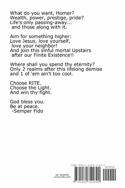 Only a naive 19 when I began, finished with gobs of helpful insights, engrossing wit, sardonic satire that'd make anyone cognizant this is a test of our Finite Existence; full of tall-true-tales making U.S. passionate for Heaven-Above: a novel of aggressive conundrums, Salvador-Dali-homily, and savvy MHz from a severely, head-injured-Catholic. Perfect for a rainy day when you realize the Son's behind the clouds.