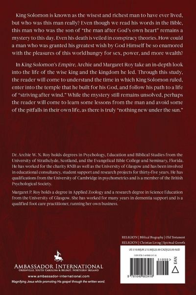 King Solomon is known as the wisest and richest man to have ever lived, but who was this man really? Even though we read his words in the Bible, this man who was the son of "the man after God's own heart" remains a mystery to this day. Even his death is veiled in conspiracy theories. How could a man who was granted his greatest wish by God Himself be so enamored with the pleasures of this world-hungry for sex, power, and more wealth? In King Solomon's Empire, Archie and Margaret Roy take an in-depth look into the life of the wise king and the kingdom he led. Through this study, the reader will come to understand the time in which King Solomon ruled, enter into the temple that he built for his God, and follow his path to a life of "striving after wind." While the mystery still remains unsolved, perhaps the reader will come to learn some lessons from the man and avoid some of the pitfalls in their own life, as there is truly "nothing new under the sun."