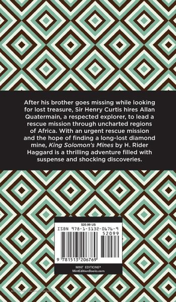 When George Neville vanishes while searching for King Solomon's diamond mines in Africa, his brother, Sir Henry Curtis, knows that he cannot find his brother without help. Said to be located in an unexplored and dangerous region, Curtis seeks out Allan Quatermain, an esteemed hunter and explorer. However, Quatermain is reluctant to help, due to the dangerous nature of the rescue mission, and out of concern for his son, who would be defenseless if Quatermain was unable to return. After making a deal to ensure his son's wellbeing in the event of an untimely death, Quatermain and Curtis start to assemble an expedition group. With the help of an old map said to have been used by a man who claimed to have found King Solomon's treasure, Quatermain and Curtis embark on a perilous rescue mission with their crew. As they trek across unfamiliar land with low supplies, they struggle to overcome the harsh conditions of the terrain, causing tragic accidents and breeding doubt that they will make it back home alive. But when they stumble into an unrelenting cave, the group of explorers make a shocking discovery and meet a native group on the brink of a civil war, complicating their mission even further. First published in 1885, King Solomon's Mines by H. Rider Haggard was an innovative novel of the Victorian era, and is considered to be the novel that founded the lost world genre. King Solomon's Mines has since inspired many major authors, and adaptations in film, comics, and radio. Meant to be enjoyed by all ages, King Solomon's Mines caters to a wide audience and delivers an exciting narrative full of wit and imagination that remains relevant and fun for contemporary readers. This edition of King Solomon's Mines by H. Rider Haggard features a new, eye-catching cover design and is printed in a font that is both modern and readable. With these accommodations, King Solomon's Mines caters to a contemporary audience while preserving the original innovation and adventure of H. Rider Haggard's work. Since our inception in 2020, Mint Editions has kept sustainability and innovation at the forefront of our mission. Each and every Mint Edition title gets a fresh, professionally typeset manuscript and a dazzling new cover, all while maintaining the integrity of the original book. With thousands of titles in our collection, we aim to spotlight diverse public domain works to help them find modern audiences. Mint Editions celebrates a breadth of literary works, curated from both canonical and overlooked classics from writers around the globe.