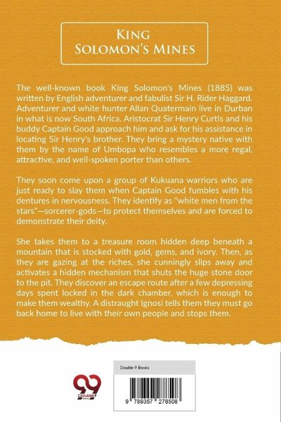 The well-known book King Solomon's Mines (1885) was written by English adventurer and fabulist Sir H. Rider Haggard. Adventurer and white hunter Allan Quatermain live in Durban in what is now South Africa. Aristocrat Sir Henry Curtis and his buddy Captain Good approach him and ask for his assistance in locating Sir Henry's brother. They bring a mystery native with them by the name of Umbopa who resembles a more regal, attractive, and well-spoken porter than others. They soon come upon a group of Kukuana warriors who are just ready to slay them when Captain Good fumbles with his dentures in nervousness. They identify as ""white men from the stars""-sorcerer-gods-to protect themselves and are forced to demonstrate their deity. She takes them to a treasure room hidden deep beneath a mountain that is stocked with gold, gems, and ivory. Then, as they are gazing at the riches, she cunningly slips away and activates a hidden mechanism that shuts the huge stone door to the pit. They discover an escape route after a few depressing days spent locked in the dark chamber, which is enough to make them wealthy. A distraught Ignosi tells them they must go back home to live with their own people and stops them.