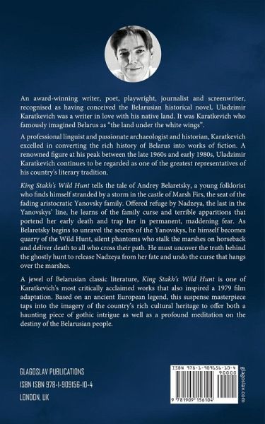 King Stakh's Wild Hunt tells the tale of Andrey Belaretsky, a young folklorist who finds himself stranded by a storm in the castle of Marsh Firs, the seat of the fading aristocratic Yanovsky family. Offered refuge by Nadzeya, the last in the Yanovskys' line, he learns of the family curse and terrible apparitions that portend her early death and trap her in permanent, maddening fear. As Belaretsky begins to unravel the secrets of the Yanovskys, he himself becomes quarry of the Wild Hunt, silent phantoms who stalk the marshes on horseback and deliver death to all who cross their path. He must uncover the truth behind the ghostly hunt to release Nadzeya from her fate and undo the curse that hangs over the marshes.