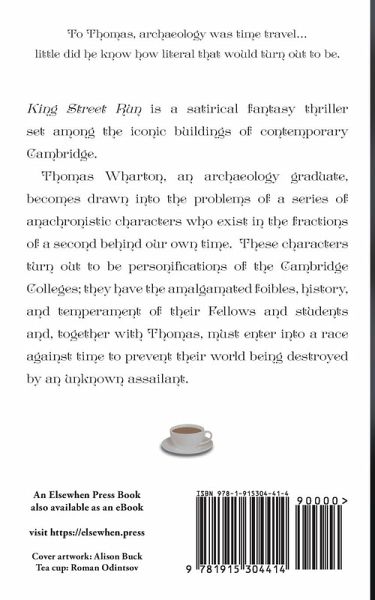 To Thomas, archaeology was time travel... little did he know how literal that would turn out to be. Thomas Wharton, an archaeology graduate, becomes drawn into the problems of a series of anachronistic characters who exist in the fractions of a second behind our own time. These characters turn out to be personifications of the Cambridge Colleges; they have the amalgamated foibles, history, and temperament of their Fellows and students and, together with Thomas, must enter into a race against time to prevent their world being destroyed by an unknown assailant. King Street Run is a satirical fantasy thriller set among the iconic buildings of contemporary Cambridge. Cover art: Alison Buck