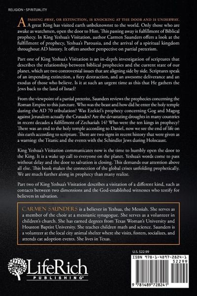 A passing away, or extinction, is knocking at the door and is underway. A great King has visited earth unbeknownst to the world. Only those who are awake as watchmen, open the door to Him. This passing away is fulfillment of Biblical prophecy. In King Yeshua's Visitation, author Carmen Saunders offers a look at the fulfillment of prophecy, Yeshua's Parousia, and the arrival of a spiritual kingdom throughout AD history. It offers another perspective on partial preterism. Part one of King Yeshua's Visitation is an in-depth investigation of scriptures that describes the relationship between biblical prophecies and the current state of our planet, which are two controversial issues that are aligning side by side. Scriptures speak of an impending extinction, a fiery destruction, and an awesome deliverance and an exodus of those who believe. Is it at such an urgent time as this that He gathers the Jews back to the land of Israel? From the viewpoint of a partial preterist, Saunders reviews the prophecies concerning the Roman Empire to this juncture. Who was the beast and how did he enter the holy temple during the AD 70 tribulation? Was Ezekiel's prophecy concerning Gog and Magog against Jerusalem actually the Crusades? Are the devastating droughts in many countries in recent decades a fulfillment of Zechariah 14? Who were the ten kings in prophecy? There was an end to the holy temple according to Daniel, now we see the end of life on this earth according to scripture. There are two signs in recent history that were given as a warning: the Titanic and the events with the Schindler Jews during Holocaust. King Yeshua's Visitation communicates now is the time to humbly open the door to the King. It is a wake up call to everyone on the planet. Yeshua's words come to pass without delay and the door to salvation is closing. This demands our attention above all else. This book makes the connection of the global crises unfolding prophetically. We are much further along in prophecy than many realize. Part two of King Yeshua's Visitation describes a visitation of a different kind, such as contacts between two dimensions and the God-established witnesses who testify for believers in salvation.