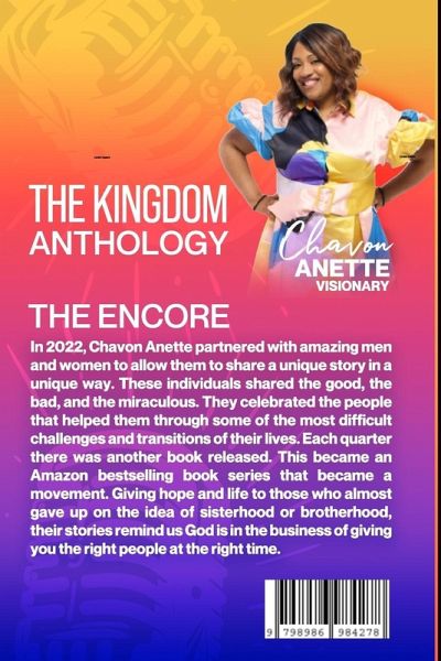 This Kingdom Anthology is a collection of all the Anthologies released in 2022 by Chavon Anette in various coauthors from My Sister Helped Me Heal Vols. 1-4 and My Brother Helped Me Heal. Throughout the 4th quarter of the year, Chavon Anette has partnered with co-authors to create a book that shared the challenges and obstacles that one has faced and how the God-ordained community helped them heal. These stories are raw and real. Through the power of storytelling and vulnerability readers are transformed by the stories within the pages of these anthologies.