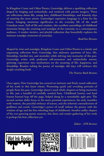 In Kingdom Come and Other Poems, Gutteridge delivers a sparkling collection shaped by longing and melancholy, and rendered with precise imagery. There are reflections about life, young love, childhood friendships, and leisurely days of roaming the town streets. Gutteridge's expressive language is a feast for the senses, bringing enormous significance to the everyday life of the small Canadian town. Full of life and wisdom, this excellent assemblage of childhood memories brings the yearning and nostalgia of the yesterday to a contemporary audience. A tender, incisive, and playful collection that beautifully explores the intimate nostalgic moments of yesterday.