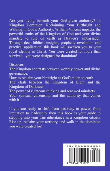 Are you living beneath your God-given authority? In Kingdom Dominion: Reclaiming Your Birthright and Walking in God's Authority, William Vincent unpacks the powerful truths of the Kingdom of God and your divine mandate to rule on earth as Heaven's ambassador. Through deep biblical insights, prophetic revelation, and practical application, this book will awaken you to your royal identity in Christ. You were created for more than survival-you were designed for dominion! Discover:The Kingdom contrasts between worldly power and divine governance. How to reclaim your birthright as God's ruler on earth. The clash between the Kingdom of Light and the Kingdom of Darkness. The power of righteous thinking and renewed mindsets. Your spiritual citizenship and the authority that comes with it. If you are ready to shift from passivity to power, from limitation to leadership, then this book is your guide to stepping into your true inheritance as a Kingdom citizen. Rise up, reclaim your territory, and walk in the dominion you were created for!