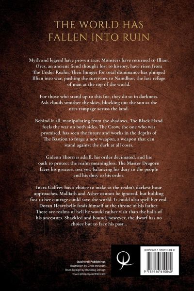 Praise for Philip C. Quaintrell's 'The Echoes Saga': 'For lovers of your classic Tolkien, this series has it all' - Alan Coleman - Amazon customer 'Best newcomer to the genre. Philip is up there with Feist and Sanderson'- Philip Spick - Amazon customer 900,000 COPIES SOLD WORLDWIDE -- THE WORLD HAS FALLEN INTO RUIN. MYTH AND LEGEND HAVE PROVEN TRUE. MONSTERS HAVE RETURNED TO ILLIAN. Orcs, an ancient fiend thought lost to history, have risen from The Under Realm. Their hunger for total dominance has plunged Illian into war, pushing the survivors to Namdhor, the last refuge of man at the top of the world. For those who stand up to this foe, they do so in darkness. Ash clouds smother the skies, blocking out the sun as the orcs rampage across the land. Behind it all, manipulating from the shadows, The Black Hand fuels the war on both sides. The Crow, the one who was promised, has seen the future and works in the depths of The Bastion to forge a new weapon, a weapon that can stand against the dark at all costs. Gideon Thorn is adrift, his order decimated, and his oath to protect the realm meaningless. The Master Dragorn faces his greatest test yet, balancing his duty to the people and his duty to his order. Inara Galfrey has a choice to make as the realm's darkest hour approaches. Malliath and Asher cannot be ignored but holding fast to her courage could save the world. It could also spell her end. Doran Heavybelly finds himself at the throne of his father. There are realms of hell he would rather visit than the halls of his ancestors. Shackled and bound, however, the dwarf has no choice but to face his past... KINGDOM OF BONES CONTINUES THIS UNMISSABLE EPIC FANTASY SERIES. -- 'I read a lot of fantasy books and I can say that this is one of the best I have read'- B. Stewart - Amazon customer ''The Echoes Saga' demonstrates a simple commitment to the power of story'- Stephen Dudley - Amazon customer