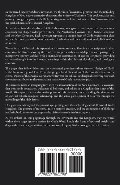 In the sacred tapestry of divine revelation, the threads of covenantal promises and the unfolding Kingdom of God weave a narrative that spans the entirety of Scripture. This book embarks on a journey through the pages of the Bible, seeking to unravel the intricacies of God's covenants and the establishment of His eternal Kingdom. As we delve into the depths of biblical theology, our gaze is fixed upon the foundational covenants that shaped redemptive history-the Abrahamic Covenant, the Davidic Covenant, and the New Covenant. Each covenant represents a unique facet of God's overarching plan, intricately connected to the grand narrative of salvation and the manifestation of His Kingdom on earth. Woven into the fabric of this exploration is a commitment to illuminate the scriptures in their contextual brilliance, allowing the reader to grasp the richness and depth of each passage. The interpretive journey unfolds with a meticulous examination of quoted scriptures, providing clarity and insight into the intended meanings within their historical, cultural, and theological contexts. The pages that follow delve into the covenantal promises-those timeless pledges of God's faithfulness, mercy, and love. From the geographical dimensions of the promised land to the eternal throne of the Davidic Covenant, we traverse the biblical landscape, discovering how each covenant contributes to the overarching narrative of God's redemptive plan. The narrative takes an intriguing turn with the introduction of the New Covenant-a covenant that transcends boundaries, welcomes all believers, and ushers in a Kingdom that is not of this world. We explore the transformative power of this covenant, understanding the significance of spiritual rebirth, Kingdom citizenship, and the active participation of believers through the indwelling of the Holy Spirit. Our gaze extends beyond the present age, peering into the eschatological fulfillment of God's Kingdom. The promise of an eternal rule, a restored creation, and the culmination of all things in Christ beckons us to contemplate the divine tapestry's final masterpiece. As we embark on this pilgrimage through the covenants and the Kingdom, may the words within these pages ignite a passion for God's Word, kindle the flame of spiritual insight, and deepen the reader's appreciation for the covenant-keeping God who reigns over all creation.