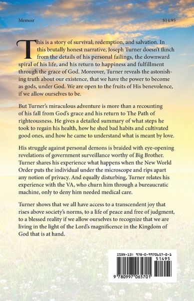 This is a story of survival, redemption, and salvation. In this brutally honest narrative, Joseph Turner doesn’t flinch from the details of his personal failings, the downward spiral of his life, and his return to happiness and fulfillment through the grace of God. Moreover, Turner reveals the astonishing truth about our existence, that we have the power to become as gods, under God. We are open to the fruits of His benevolence, if we allow ourselves to be. But Turner’s miraculous adventure is more than a recounting of his fall from God’s grace and his return to The Path of righteousness. He gives a detailed summary of what steps he took to regain his health, how he shed bad habits and cultivated good ones, and how he came to understand what is meant by love. His struggle against personal demons is braided with eye-opening revelations of government surveillance worthy of Big Brother. Turner shares his experience what happens when the New World Order puts the individual under the microscope and rips apart any notion of privacy. And equally disturbing, Turner relates his experience with the VA, who churn him through a bureaucratic machine, only to deny him needed medical care. Turner shows that we all have access to a transcendent joy that rises above society’s norms, to a life of peace and free of judgment, to a blessed reality if we allow ourselves to recognize that we are living in the light of the Lord’s magnificence in the Kingdom of God that is at hand.