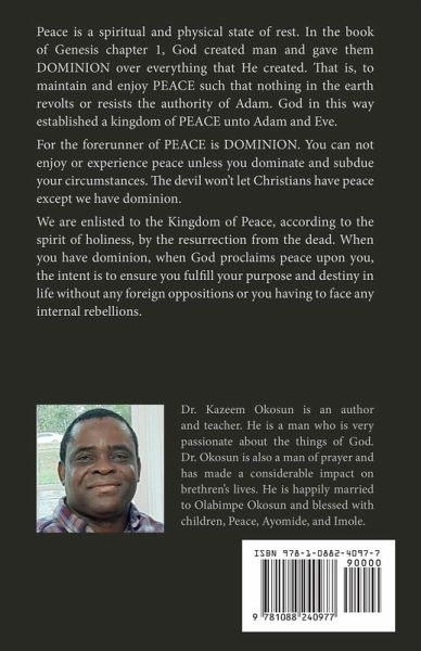 This book touches on the subject of PEACE. Peace is a spirit. it is not a realm one easily enjoys or manifests. You do not get to that Kingdom of liberty except that spirit (peace) finds expression in you. It has a WILL and you must fulfill that WILL for the Kingdom to fully have expressions in your life. Jesus told us to say peace be unto you as you step into people's domain. Because this is what the Spirit is saying. And any words said by the Spirit are also spirit and life.As you say "peace be unto you" you are ministering the spirit and also ministering the Kingdom of heaven. I pray you find life as you read with an open mind expecting the illumination of your spirit by the Holy Ghost.