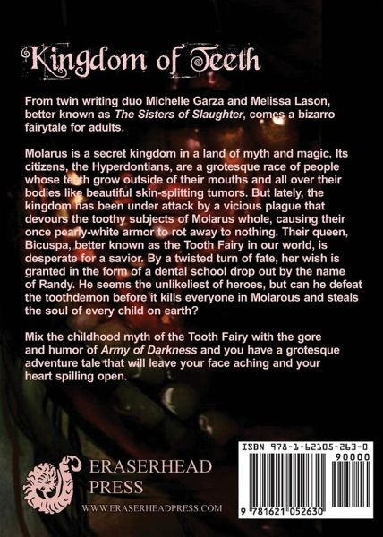 From twin writing duo Michelle Garza and Melissa Lason, better known as The Sisters of Slaughter, comes a bizarro fairytale for adults. Molarus is a secret kingdom in a land of myth and magic. Its citizens, the Hyperdontians, are a grotesque race of people whose teeth grow outside of their mouths and all over their bodies like beautiful skin-splitting tumors. But lately, the kingdom has been under attack by a vicious plague that devours the toothy subjects of Molarus whole, causing their once pearly-white armor to rot away to nothing. Their queen, Bicuspa, better known as the Tooth Fairy in our world, is desperate for a savior. By a twisted turn of fate, her wish is granted in the form of a dental school drop out by the name of Randy. He seems the unlikeliest of heroes, but can he defeat the tooth demon before it kills everyone in Molarous and steals the soul of every child on earth? Mix the childhood myth of the Tooth Fairy with the gore and humor of Army of Darkness and you have a grotesque adventure tale that will leave your face aching and your heart spilling open.