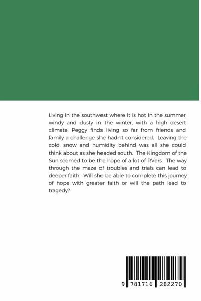 Kingdom of the Sun describes Peggy's journey from the far north to New Mexico seeking warmer weather. The journey south opens up new adventures in faith as she and Wally find new friends in a desert environment. Everyone seemed to have a pet at the Kingdom of the Sun Retirement Complex so more animal stories are in store. Since we don't have to shovel snow there is lots of time to enjoy learning about the high desert, and the local Duck Races which they say are world famous.