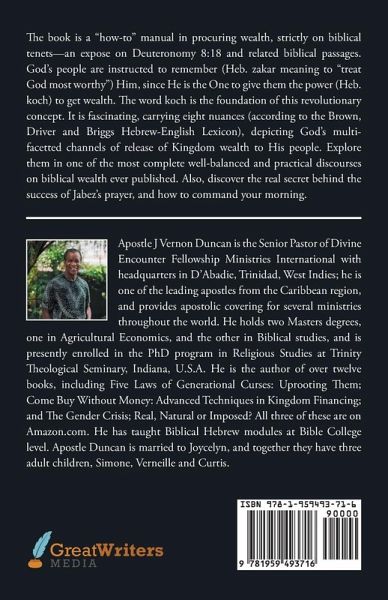 The book is a "how-to" manual in procuring wealth, strictly on biblical tenets-an expose on Deuteronomy 8:18 and related biblical passages. God's people are instructed to remember (Heb. zakar meaning to "treat God most worthy") Him, since He is the One to give them the power (Heb. koch) to get wealth. The word koch is the foundation of this revolutionary concept. It is fascinating, carrying eight nuances (according to the Brown, Driver and Briggs Hebrew-English Lexicon), depicting God's multi-facetted channels of release of Kingdom wealth to His people. Explore them in one of the most complete well-balanced and practical discourses on biblical wealth ever published. Also, discover the real secret behind the success of Jabez's prayer, and how to command your morning.