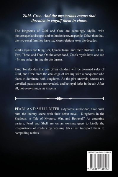 PEARL AND SHELL RITER, a dynamic author duo, have burst onto the literary scene with their debut novel, "Kingdoms in the Shadows: A Tale of Mystery, War, and Betrayal." As emerging writers, Pearl and Shell are on an exciting quest to kindle the imaginations of readers by weaving tales that transport them to compelling realms.