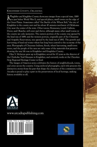 Kingfisher and Kingfisher County showcases images from a special time, 1889 to just before World War II, and special places, small towns on the edge of the Great Plains. Sometimes called "the Buckle of the Wheat Belt," the city of Kingfisher is the county seat and lies about 45 minutes northwest of Oklahoma City near the center of the state. Other towns, Hennessey, Loyal, Cashion, Dover, and Okarche, still exist and thrive, although many other small towns in the county are only memories. The eastern portion of the county was opened by the land run of 1889, and the western portion, originally part of the Cheyenne and Arapaho Reservation, was opened by the land run of 1892. The growth and harvesting of hard red winter wheat has long been central to the economy of the area. Photographs of Cheyenne Indians, floods, wheat harvesting, small-town stores, and the people of the area are only some of the materials that preserve showing the way life was in Kingfisher and Kingfisher County.