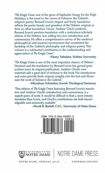 Solomon ibn Gabirol (1021-1058) of Spain was a Jewish philosopher and moralist who is perhaps best known for the beautiful forty-stanza poem Keter Malkhut (The Kingly Crown). Hailed by scholars as one of the most important classics of Hebrew literature, The Kingly Crown employs the metaphor of a king in his palace to describe the relationship between humanity and God. This medieval poem is full of vivid imagery and scriptural references. Within its many layers of meaning, readers will find not only an extended prayer and meditation, but also signs of the neoplatonic philosophy that formed the foundation of Gabirol's cosmology and theology. The University of Notre Dame Press is pleased to bring back in print Bernard Lewis's lyrical translation of The Kingly Crown. This new edition includes Lewis's extensive notes and introduction as well as a new introduction, notes, and detailed philosophical commentary by Andrew L. Gluck. Gluck's meticulous correction of errors in the Hebrew text make this the most accurate version ever published with an English translation. Facing page Hebrew verse and English translation, as well as a new bibliographical section about the poet and poem, add to the utility and value of this wonderful book. General readers will delight in The Kingly Crown's lucid text and scholars will discover a wealth of previously unavailable notes and historical information.