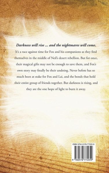 Darkness will rise ... and the nightmares will come. It's a race against time for Fox and his companions as they find themselves in the middle of Neil's desert rebellion. But for once, their magical gifts may not be enough to save them, and Fox's own story may finally be their undoing. Never before has so much been at stake for Fox and Lai, and the bonds that hold their entire group of friends together. But darkness is rising, and they are the one hope of light to burn it away.