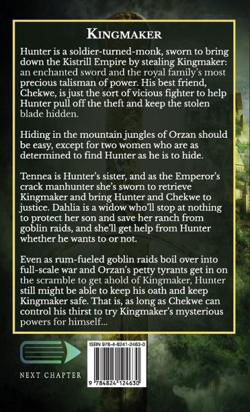 Hunter is a soldier-turned-monk, sworn to bring down the Kistrill Empire by stealing Kingmaker: an enchanted sword and the royal family's most precious talisman of power. His best friend, Chekwe, is just the sort of vicious fighter to help Hunter pull off the theft and keep the stolen blade hidden. Hiding in the mountain jungles of Orzan should be easy, except for two women who are as determined to find Hunter as he is to hide. Tennea is Hunter's sister, and as the Emperor's crack manhunter she's sworn to retrieve Kingmaker and bring Hunter and Chekwe to justice. She's got a company of elite cavalry and a bag of enchanted tricks to help, and she's tightening the noose. Even worse, she knows Hunter's weakness: his bruised and lonely heart. Dahlia is a widow who'll stop at nothing to protect her son and save her ranch from goblin raids, and she'll get help from Hunter whether he wants to or not. Even as rum-fueled goblin raids boil over into full-scale war and Orzan's petty tyrants get in on the scramble to get ahold of Kingmaker, Hunter still might be able to keep his oath and keep Kingmaker safe. That is, as long as Chekwe can control his thirst to try Kingmaker's mysterious powers for himself...