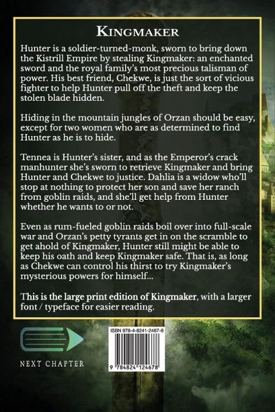 Hunter is a soldier-turned-monk, sworn to bring down the Kistrill Empire by stealing Kingmaker: an enchanted sword and the royal family's most precious talisman of power. His best friend, Chekwe, is just the sort of vicious fighter to help Hunter pull off the theft and keep the stolen blade hidden. Hiding in the mountain jungles of Orzan should be easy, except for two women who are as determined to find Hunter as he is to hide. Tennea is Hunter's sister, and as the Emperor's crack manhunter she's sworn to retrieve Kingmaker and bring Hunter and Chekwe to justice. She's got a company of elite cavalry and a bag of enchanted tricks to help, and she's tightening the noose. Even worse, she knows Hunter's weakness: his bruised and lonely heart. Dahlia is a widow who'll stop at nothing to protect her son and save her ranch from goblin raids, and she'll get help from Hunter whether he wants to or not. Even as rum-fueled goblin raids boil over into full-scale war and Orzan's petty tyrants get in on the scramble to get ahold of Kingmaker, Hunter still might be able to keep his oath and keep Kingmaker safe. That is, as long as Chekwe can control his thirst to try Kingmaker's mysterious powers for himself... This is the large print edition of Kingmaker, with a larger font / typeface for easier reading.