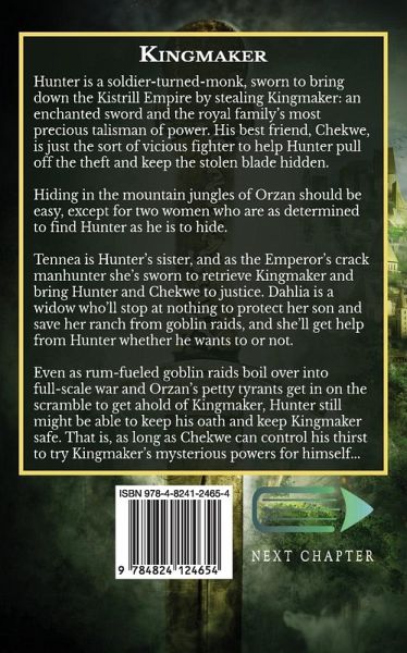 Hunter is a soldier-turned-monk, sworn to bring down the Kistrill Empire by stealing Kingmaker: an enchanted sword and the royal family's most precious talisman of power. His best friend, Chekwe, is just the sort of vicious fighter to help Hunter pull off the theft and keep the stolen blade hidden. Hiding in the mountain jungles of Orzan should be easy, except for two women who are as determined to find Hunter as he is to hide. Tennea is Hunter's sister, and as the Emperor's crack manhunter she's sworn to retrieve Kingmaker and bring Hunter and Chekwe to justice. She's got a company of elite cavalry and a bag of enchanted tricks to help, and she's tightening the noose. Even worse, she knows Hunter's weakness: his bruised and lonely heart. Dahlia is a widow who'll stop at nothing to protect her son and save her ranch from goblin raids, and she'll get help from Hunter whether he wants to or not. Even as rum-fueled goblin raids boil over into full-scale war and Orzan's petty tyrants get in on the scramble to get ahold of Kingmaker, Hunter still might be able to keep his oath and keep Kingmaker safe. That is, as long as Chekwe can control his thirst to try Kingmaker's mysterious powers for himself...