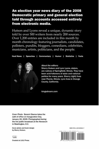 An election year news diary of the 2008 Democratic primary and general election told through accounts accessed entirely from electronic media. The editors reveal a unique, dynamic story told by over 500 writers from nearly 200 sources. Over 1,200 entries are included in this month by month chronology featuring journalists, candidates, pollsters, pundits, bloggers, comedians, celebrities, musicians, artists, politicians, and the people. Entries include hard news, speeches, commentary, humor, statistics, and facts surrounding the 2008 election of Barack Obama. A companion website is also available at kingsdream.com .