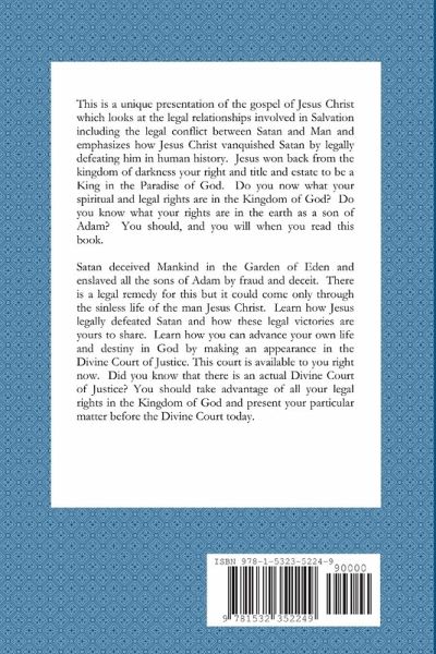 This unique presentation of the gospel of Jesus Christ looks at the legal relationships of salvation and the legal conflict between Satan and Man. Emphasis is placed on how Jesus Christ vanquished Satan by legally defeating him in human history. Jesus won back from the kingdom of darkness your right and title and estate in to be a King in the Paradise of God. Do you know what your spiritual legal rights are in the Kingdom of God? Do you know what your rights are in the Earth as a son of Adam? You should, and when you read this book you will. Satan deceived Mankind in the Garden of Eden and enslaved all the sons of Adam by fraud and deceit. There is a legal remedy for this but it could only come through the sinless life of the man Jesus Christ. Learn the legal rules about how Jesus defeated Satan and how these legal victories are yours to share and how they can help you advance your own life and destiny in God. The Divine Court of Justice is available to you right now. Forms of practice included.