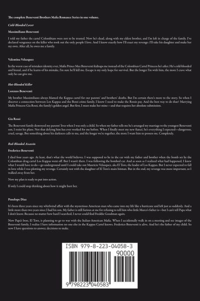 The complete Beneventi Brothers Mafia Romance Series in one volume. Cold-Blooded Lover Massimiliano Beneventi I told my father the cartel Colombians were not to be trusted. Now he's dead, along with my eldest brother, and I'm left in charge of the family. I've declared vengeance on the killer who took out the only people I love. And I know exactly how I'll exact my revenge: I'll take his daughter and make her my own. After all, he owes me a family. Valentina Velazquez In the worst case of mistaken identity ever, Mafia Prince Max Beneventi kidnaps me instead of the Colombian Cartel Princess he's after. He's cold-blooded and brutal, and if he learns of his mistake, I'm sure he'll kill me. Escape is my only hope for survival. But the longer I'm with him, the more I crave what only he can give me. Hot-Blooded Killer Lorenzo Beneventi My brother Massimiliano always blamed the Kappas cartel for our parents' and brothers' deaths. But I'm certain there's more to the story. So when I discover a connection between Los Kappas and the Rossi crime family, I know I need to make the Rossis pay. And the best way to do that? Marrying Mafia Princess Gia Rossi, the family's golden angel. But first, I must make her mine—and that requires her absolute submission. Gia Rossi The Beneventi family destroyed my parents' lives when I was only a child. So when my father tells me he's arranged my marriage to the youngest Beneventi son, I resist his plans. Not that defying him has ever worked for me before. When I finally meet my new fiancé, he's everything I expected—dangerous, cruel, savage. But something about his darkness calls to me, and the longer we're together, the more I want him to possess me. Completely. Red-Blooded Assassin Frederico Beneventi I died four years ago. At least, that's what the world believes. I was supposed to be in the car with my father and brother when the bomb set by the Colombian drug cartel Los Kappas went off. But I wasn't there. I was following the bombed car. And as soon as I realized what had happened, I knew what I would have to do—go underground until I could take out Mauricio Velazquez, aka El Toro, the leader of Los Kappas. But I never expected to fall in love while I was plotting my revenge. Certainly not with the daughter of El Toro's main hitman. But in the end, my revenge was more important, so I walked away from her. Now my plan is ready to put into action. If only I could stop thinking about how it might hurt her. Penelope Diaz It's been three years since my whirlwind affair with the mysterious American man who came into my life like a hurricane and left just as suddenly. And a little more than two years since I had his son. My father is still furious at me for refusing to tell him who little Marco's father is—but I can't tell Papa what I don't know. Because no matter how hard I searched, I never could find Freddie Goodman again. Now Papa's boss, El Toro, is planning to go to war with the Italian-American Mafia. When I accidentally walk in on a meeting and see images of the Beneventi family, I realize I have information no one else in the Kappas Cartel knows. Frederico Beneventi is alive. And he's the father of my child. So now I have questions to answer, decisions to make.