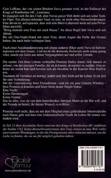 Cain LeBlanc, der von seinen Brüdern Nova genannt wird, ist der Enforcer des Kings of Retribution MC, Louisiana. Er engagiert sich für den Club, aber Novas ganze Welt dreht sich um seine Tochter Piper. Ein alleinerziehender Vater zu sein, ist nicht ohne Herausforderungen. Eine davon ist, aufzupassen, dass sich sein Biker-Lebensstil nicht auf sein Privatleben auswirkt. "Bring niemals eine Frau mit nach Hause." An diese Regel hält Nova sich seit Jahren. Bis ein One-Night-Stand mit einer Frau, deren Augen die Farbe des Ozeans haben, ihn nach mehr verlangen lässt. Nach einer Auseinandersetzung mit einem anderen Biker gerät Nova in Schwierigkeiten mit dem Gesetz. Und als ob die drohende Haftstrafe nicht schon genug wäre, taucht ein Geist aus seiner Vergangenheit auf und stiftet Unruhe. Die meiste Zeit ihres Lebens verbrachte Promise Bailey damit, sich danach zu sehnen, von der einzigen Familie, die sie je kannte, akzeptiert zu werden. Also arbeitet sie weiter hart und beweist sich als Anwältin in der Kanzlei ihres Stiefvaters. Nachdem ihr Verlobter sie betrügt, ändert sich ihre Sicht auf ihr Leben. Es ist Zeit für eine Veränderung. Mit der Unterstützung ihrer Freundinnen - und ein ein paar Gläsern Whiskey - lässt Promise es krachen und feiert ihren neuen Single-Status. Eine Nacht. Keine Hemmungen. Keine Namen. Das ist alles, was sie von dem hinreißenden, bärtigen Mann an der Bar will, und der Fremde ist bereit, ihr diesen Wunsch zu erfüllen. Promise weiß nicht, dass sie mit dem Mitglied eines gefürchteten Motorradclubs nach Hause geht und dass eine leidenschaftliche Nacht ihr Leben für immer verändern wird. In Teil 13 ihrer fesselnden Serie rund um den Kings of Retribution MC entführen die beiden USA Today-Bestsellerautorinnen ihre Fans erneut in eine Welt voller unerwarteter Wendungen, in der die Protagonisten alles riskieren müssen, um die Liebe zu finden, die sie nie für möglich gehalten hätten.